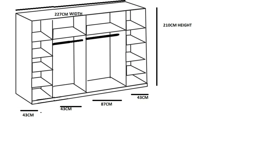 This Lotto Sliding Wardrobe.This wardrobe has four sections, left and right section has 8 shelves and middle two sections has 2 hanging rails and 2 shelf s which is perfect for additional storage space. The Wardrobe is supported by a strong and durable carcase that will complete the look of your bedrooms.The large mirror on the front is perfect for dressing in the morning.it has two hanging rails, one large shelves and 9 small Shelves.