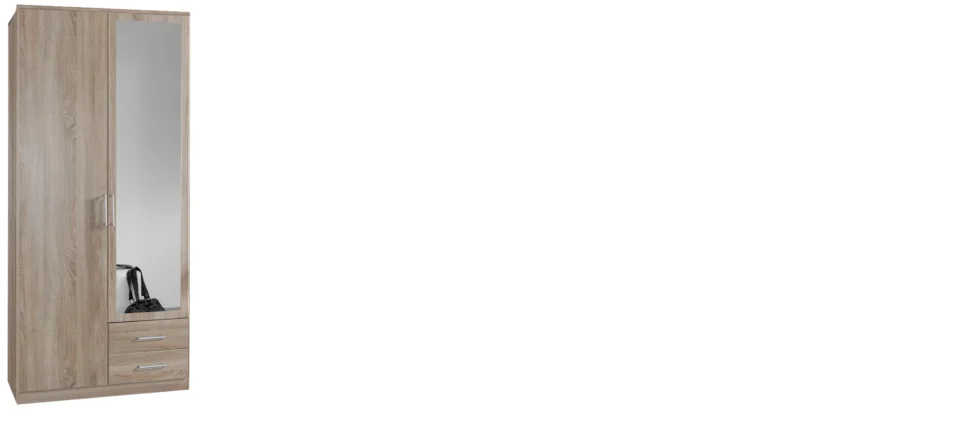 The Osaka 2 Door 2 Drawer Wardrobe offers a combination of hanging, shelving and drawer space. The wardrobe has trendy long handles along with the right side door being mirrored which give the wardrobe a modern look. The wardrobe has one hanging rail, four storage shelves divide in two section and 2 drawers.