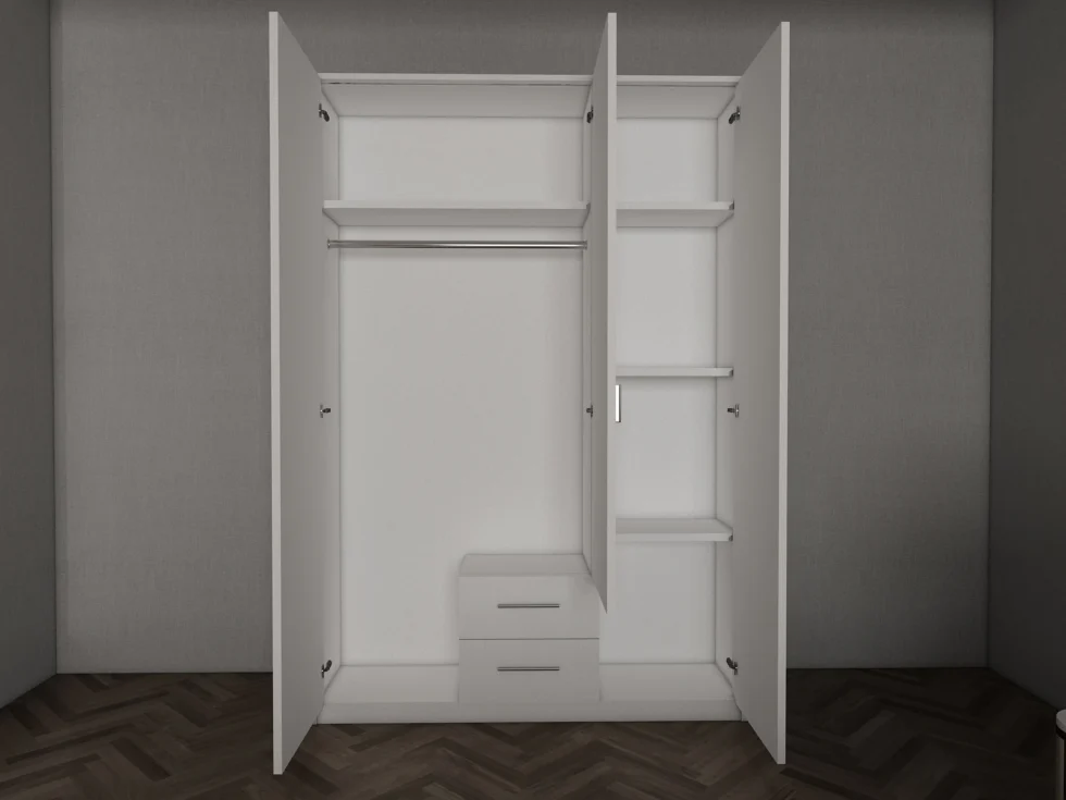 This wardrobe has a sleek and contemporary look,finished with Mirror Doors.The wardrobe has trendy handles which gives the wardrobe a modern look .The wardrobe has one large hanging rail one large shelf and three small shelves