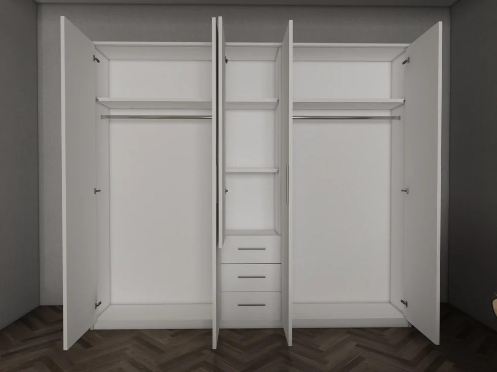 This wardrobe has a sleek and contemporary look,finished with Mirror Door.The wardrobe has trendy handles which gives the wardrobe a modern look .The wardrobe has two hanging rail and two large shelves and 3 small shelves