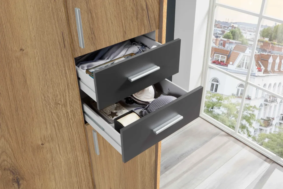 The vegas Graphite 4 Door wardrobe has a sleek and contemporary look,finished with Mirrored door.The wardrobe has trendy handles which gives the wardrobe a modern look .The wardrobe has 1 hanging rail and total 7 shelves divide in three section.